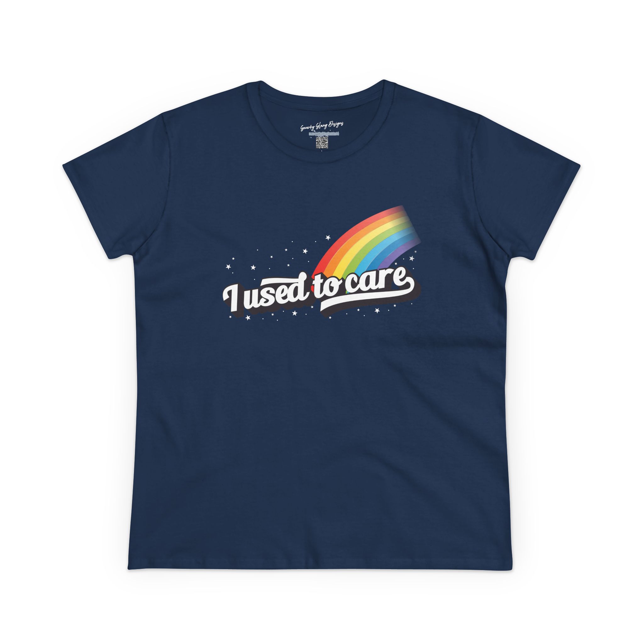 Slide into this midweight cotton tee and let the message do the talking. The wry "I used to care" retro text, rainbow and star accents give off playful, devil-may-care energy — the kind that comes after you've learned to pick your battles. Soft, structured cotton and a semi-fitted cut make it an easy grab for slow mornings, coffee runs, or low-effort hangouts. It layers neatly under a denim jacket or wears solo with your favorite jeans when you want to project quiet confidence and a little sarcasm. Wear it to birthdays, laid-back holiday gatherings, or those days you’re reclaiming your time — it reads like a wink to anyone who gets that life’s too short for extra stress. Product features - 100% cotton solid colors; blends in heathers and antiques for softness and durability - Medium-weight fabric (5.3 oz/yd²) for structure without bulk - Semi-fitted silhouette that layers well or stands alone - Reinforced construction: double-needle hems, side seams, and neck/shoulder tape for long-lasting shape - Tear-away label for itch-free comfort Care instructions - Machine wash: cold (max 30C or 90F) - Do not bleach - Tumble dry: low heat - Iron, steam or dry: low heat - Do not dryclean