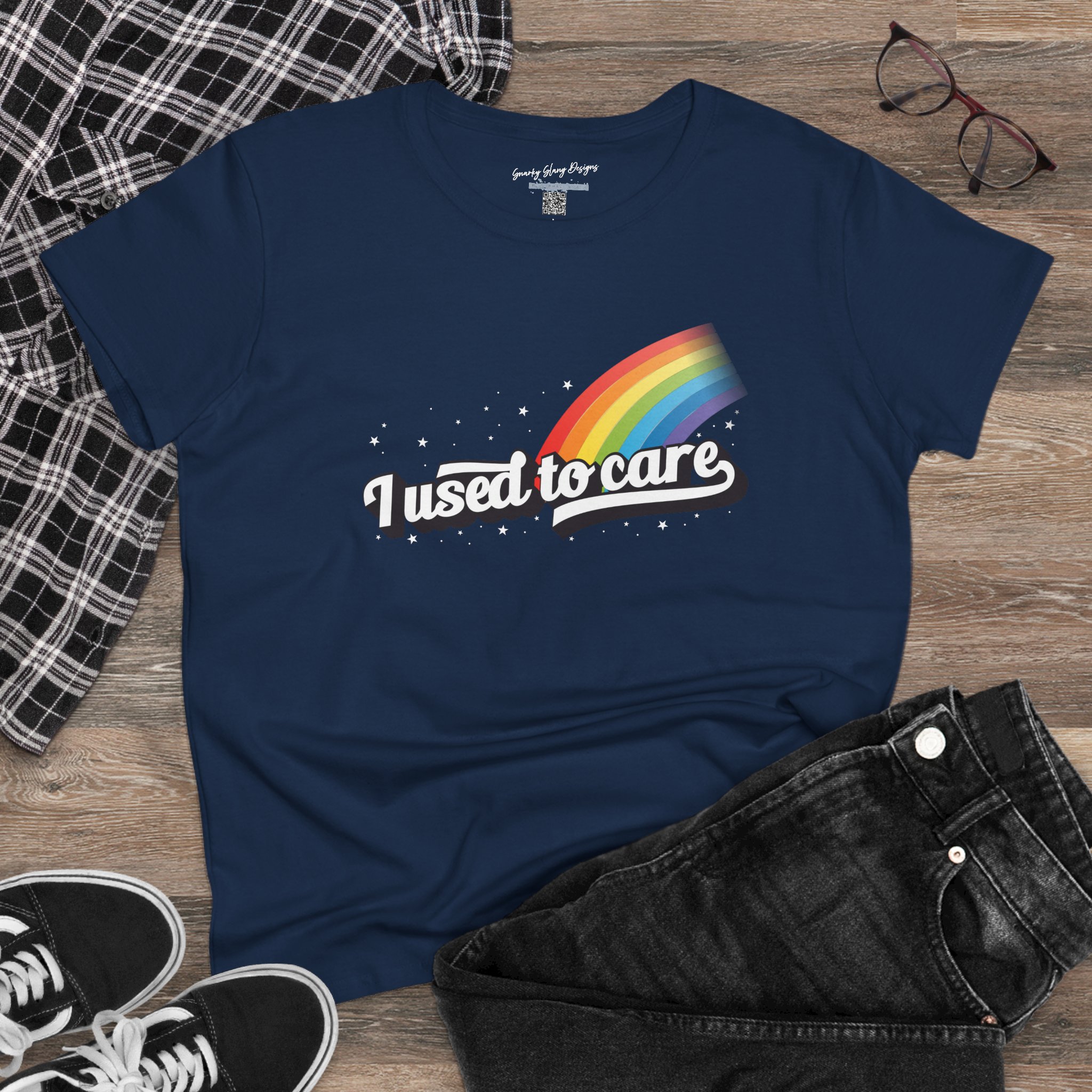 Be the first to review “I Used to Care Retro Rainbow Tee — Women’s Funny Graphic T-Shirt”