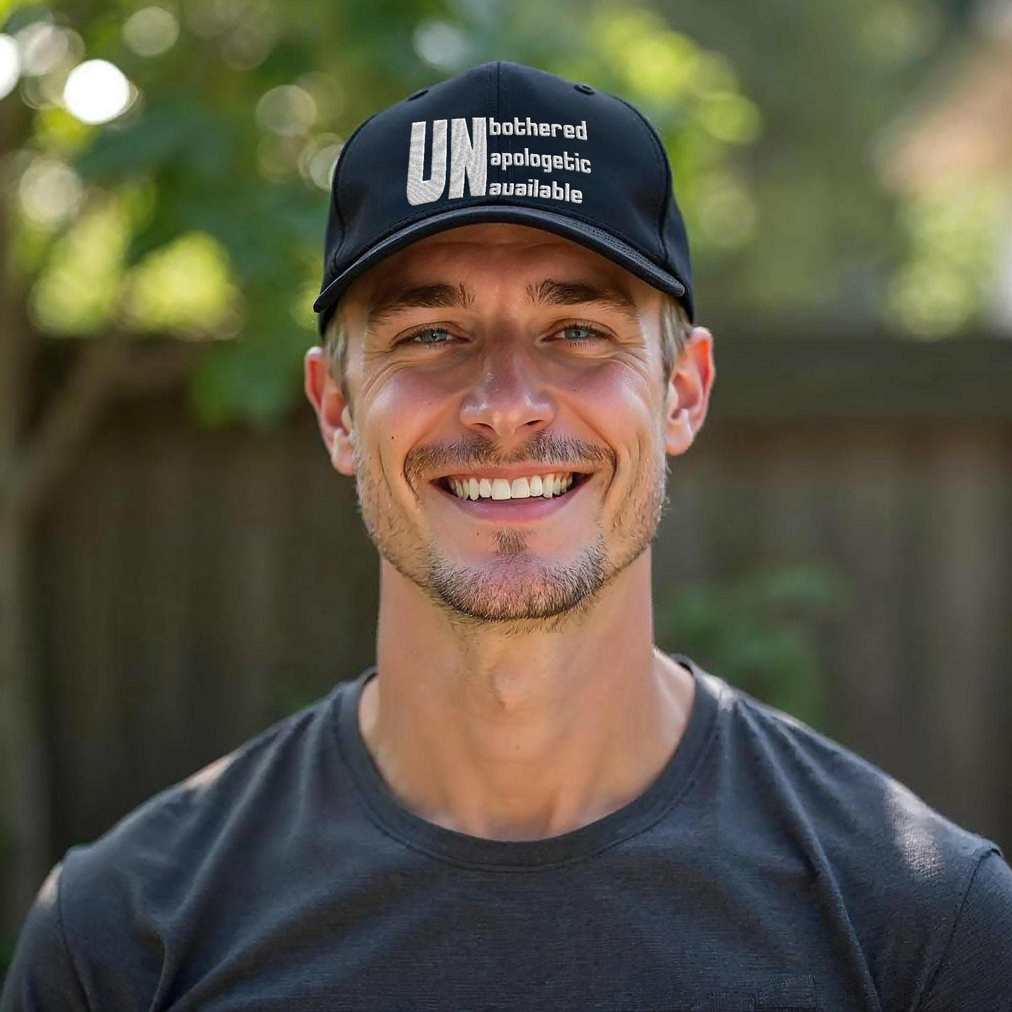 Slip this classic dad cap on and let the world know your mood before you say a word. The matte-black canvas and crisp white lettering — UNbothered, UNapologetic, UNavailable — read like a quiet manifesto. It settles low on your brow, soft and unstructured, so you can move through the day without fuss. Wear it on a slow weekend coffee run, at an outdoor market when you want to stay low-key, or during a road trip when the only plan is to keep things mellow. The precurved visor and subtle antique-brass hardware give it a lived-in look that pairs with well-worn denim, tired sneakers, and a confident, unbothered stride.